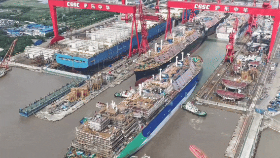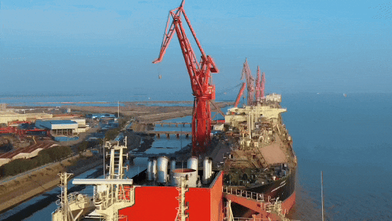 在长江入海口,长兴岛码头,眼前是在建的数艘LNG船,宛如一座座海上城堡。