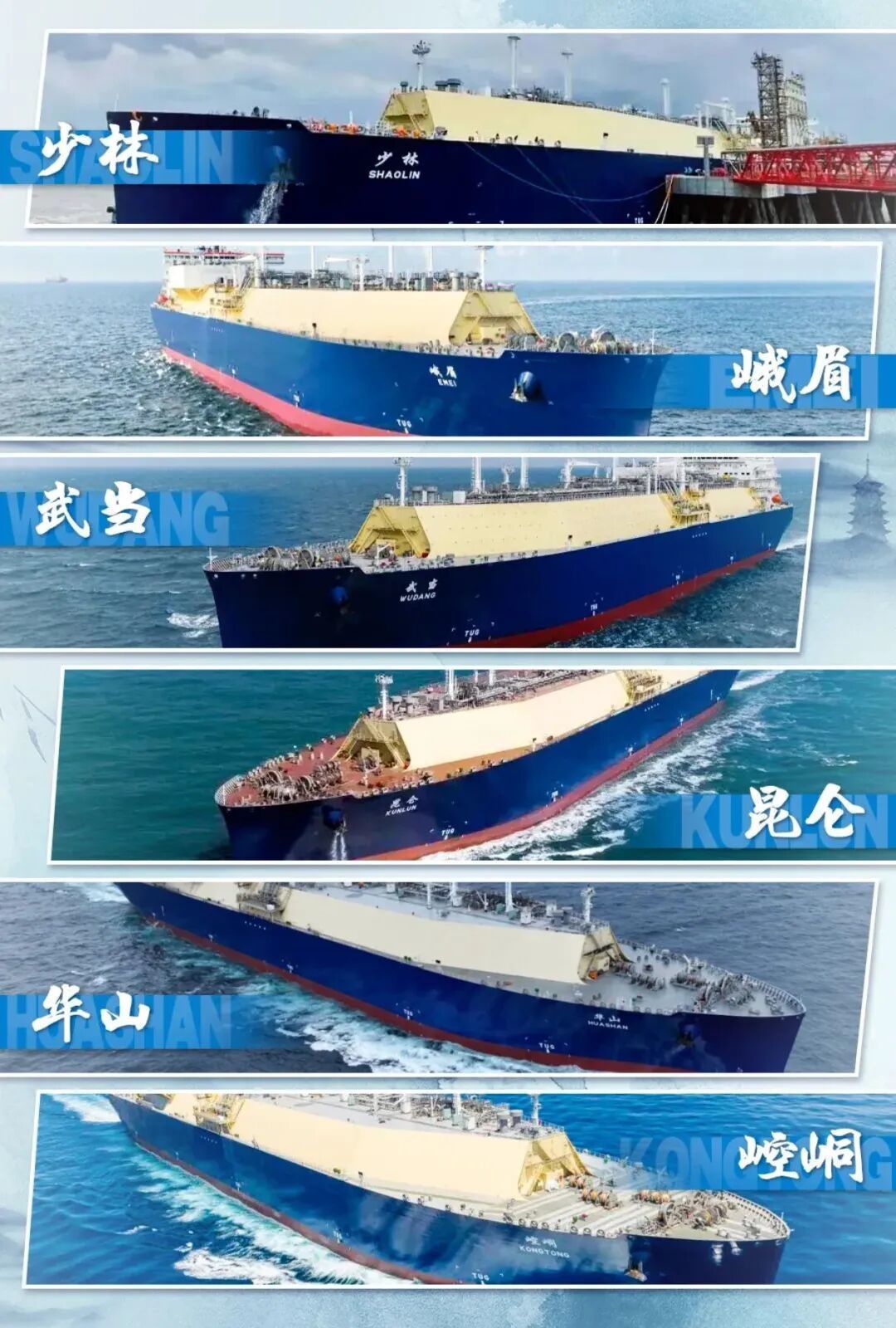 先看这组“武林风”满满的姓名——“少林”“武当”“昆仑”“峨眉”“华山”“崆峒”。是不是瞬间脑补出各大门派高手齐聚的画面?这些在武侠国际里响当当的门派,现在成了LNG船的名号,似乎给这些海上巨轮赋予了“独门绝技”,奔驰大洋看护动力安全,妥妥的“海上武林天团”既视感。